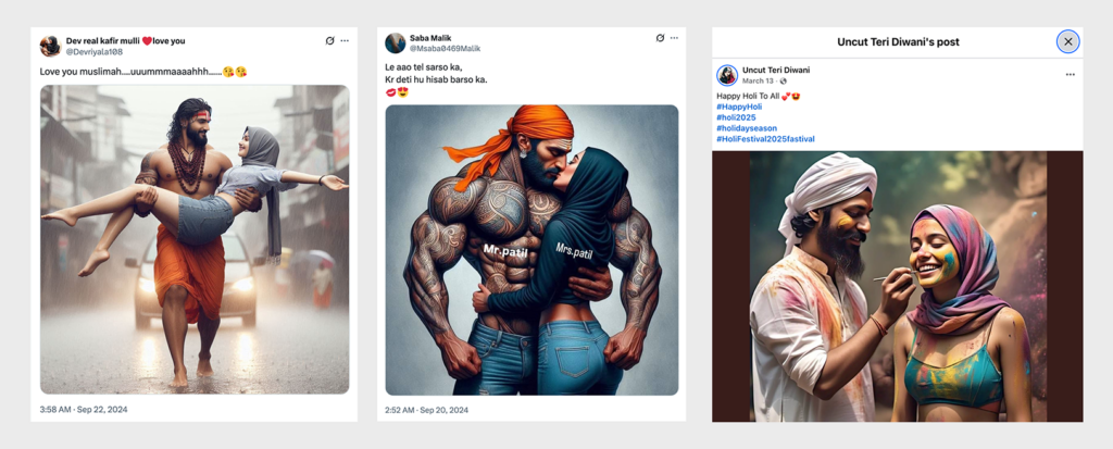 This pattern shows that the use of AI imagery to promote Islamophobic narratives only gained traction in 2024, marking a turning point in both volume and sophistication of content within the Hindu nationalist ecosystem. A key driver of this shift was the growing popularity and wider availability of advanced text-to-image tools, which made producing visuals easier. OpenAI’s integration of DALL·E 3 into ChatGPT in September 2023 likely accelerated the adoption of such tools, lowering barriers to use and fueling their incorporation into propaganda at scale.