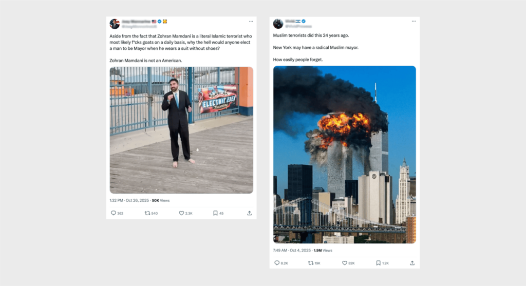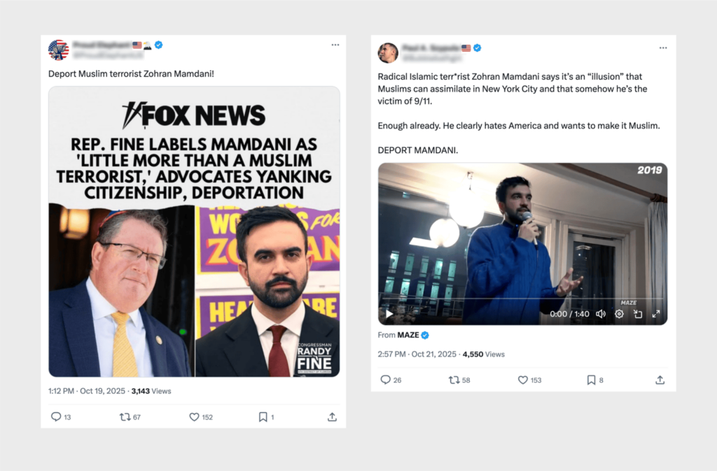 This report provides an update of our previous analysis of the New York City mayoral primary, since Mamdani won the Democratic party nomination on June 24, 2025, up to October 31. New data collected from this time period aligns with our previous findings of the key themes dominating social media discourse. Namely, an overarching emphasis on Islamophobia, constructing Mamdani as a terrorist, jihadist, or radical Muslim, as well as positioning Muslim Americans as an overall target out-group; equating Mamdani’s Muslim faith and Islam as inherently incompatible with American political and civic values through the use of dog whistles and conspiratorial narratives; questioning Mamdani’s status as a naturalized U.S. citizen with calls for his denaturalization and deportation; and fomenting nativist sentiment that portrays Mamdani as unpatriotic and an enemy to the nation.