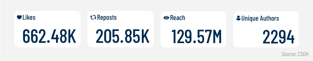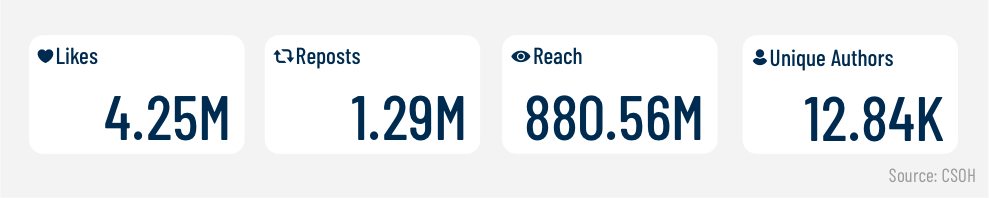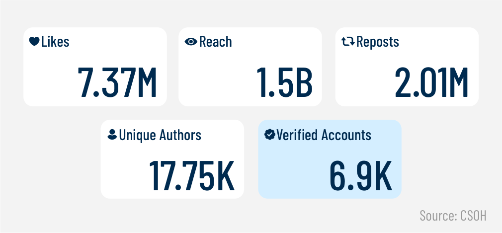 - Original posts collectively received 7.37 million likes and 2.01 million reposts, generating an estimated reach of 1.5 billion.