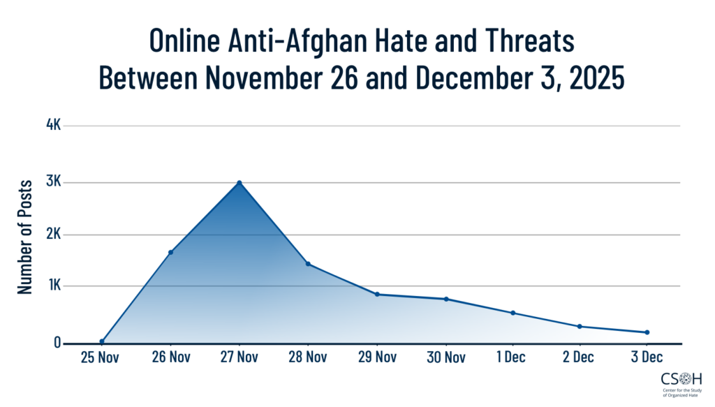 Following the shooting of two National Guardsmen in Washington, D.C., on November 26, the Center for the Study of Organized Hate (CSOH) observed a sharp surge in online hate and threats targeting Afghans. Between November 26 and December 3, we recorded 8,785 posts across X (formerly Twitter), Facebook, and Instagram containing explicit anti-Afghan hate.