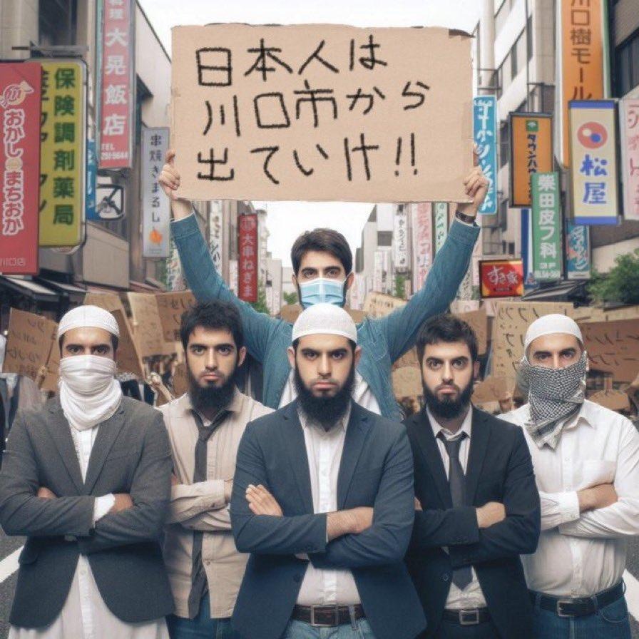 There has been a proliferation of hateful graphics targeting Kurds online, including a fabricated, AI-generated image of angry Kurds bearing a sign displaying the text “the Japanese should get out of Kawaguchi.” The image, which notably only depicts men, garnered approximately 713,000 views on X.