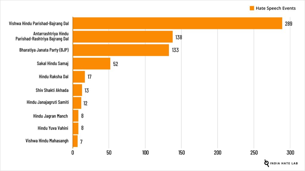 The ecosystem of hate maintained its highly organized character in 2025. As in the previous year, the Bharatiya Janata Party (BJP) and Rashtriya Swayamsevak Sangh (RSS) affiliates, such as the Vishwa Hindu Parishad (VHP) and the Bajrang Dal, were central drivers of in-person hate speech events. Complementing these organizations, other far-right groups, including the Antarrashtriya Hindu Parishad, Rashtriya Bajrang Dal, Sakal Hindu Samaj, and the Hindu Janajagruti Samiti (HJS), also played a significant role as architects and facilitators of hate-speech mobilization.