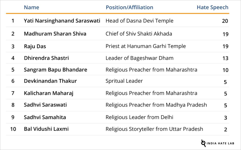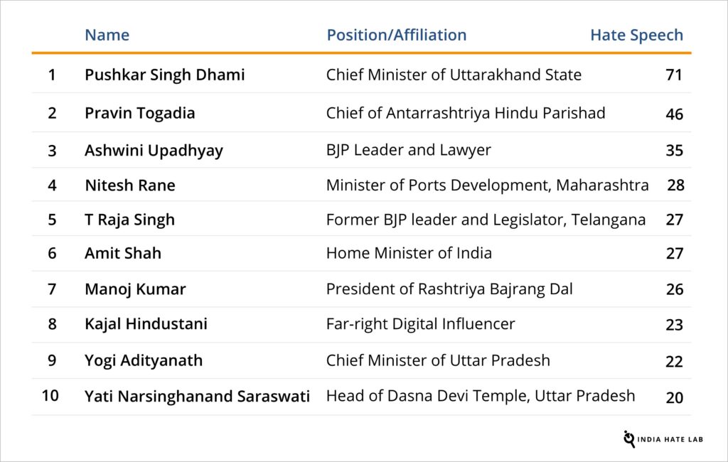 - Uttarakhand Chief Minister Pushkar Singh Dhami emerged as the most prolific hate-speech actor in 2025, with 71 speeches, followed by Antarrashtriya Hindu Parishad chief Pravin Togadia (46) and BJP leader Ashwini Upadhyay (35).