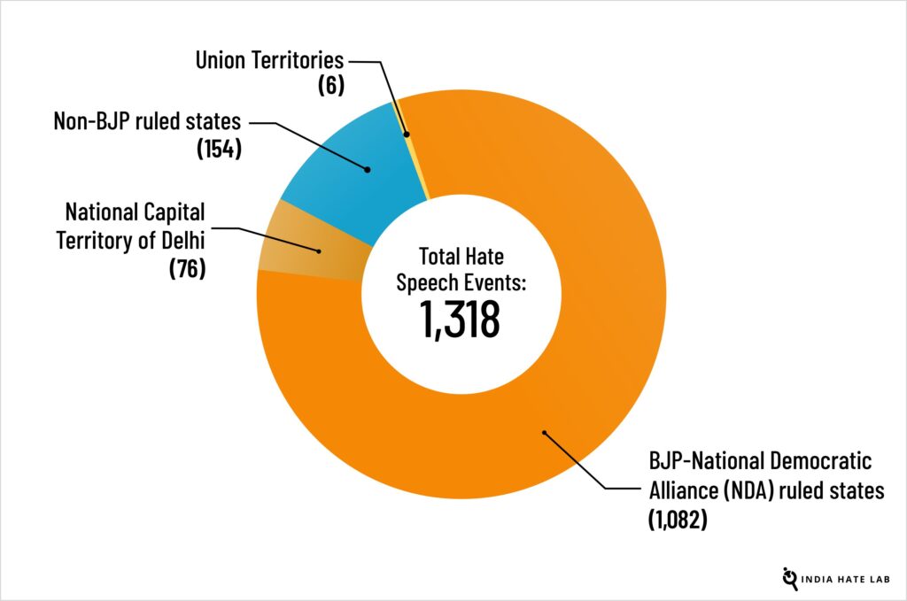 - Uttar Pradesh (266), Maharashtra (193), Madhya Pradesh (172), Uttarakhand (155), and Delhi (76) recorded the highest number of hate speech events. Across the 23 states and Union Territories analyzed, the BJP held power, either independently or as part of a coalition, in 16 jurisdictions for most of the year.