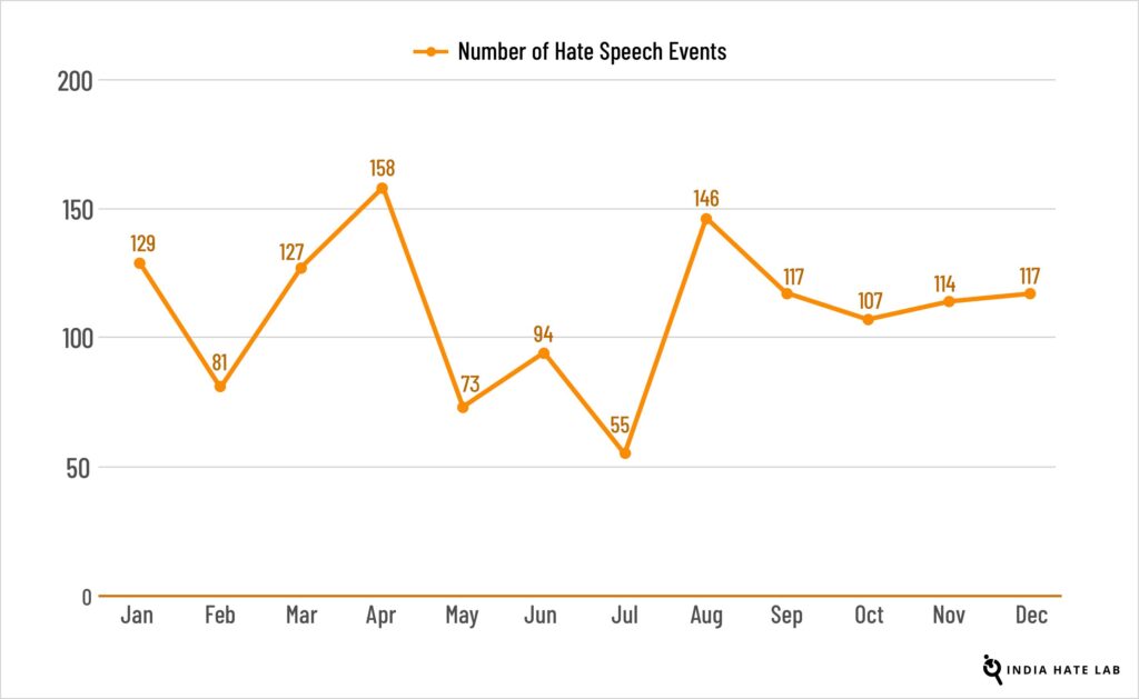 - April recorded the highest monthly spike, with 158 hate speech events coinciding with Ram Navami processions and hate rallies organized in response to the Pahalgam terror attack.