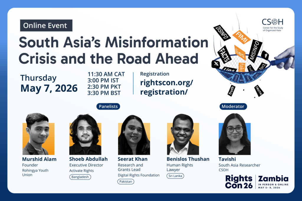 Join CSOH at RightsCon 2026 for an online event bringing together civil society organizations and experts from across South Asia to examine the structural and political drivers of disinformation, the role of platforms in enabling it, and its cross-border consequences. The discussion will focus on collaborative strategies to mitigate disinformation before it escalates into violence or diplomatic crises, and on promoting regional cooperation in a part of the world too often defined by conflict and mistrust.